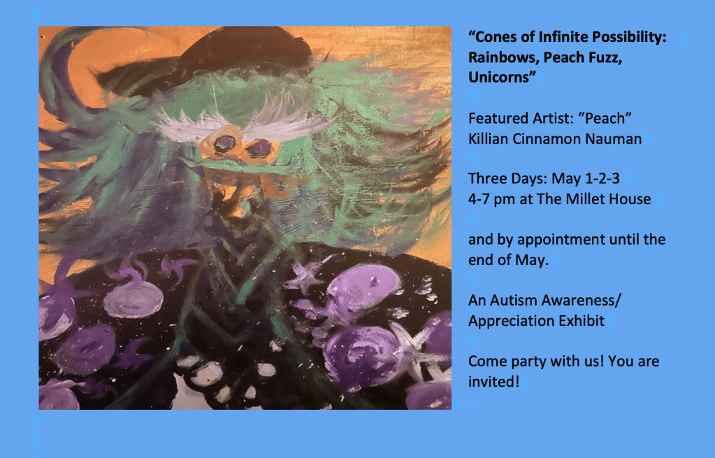 Our friend Peach is back in town and has created an art installation at The Millet House! Supporting artists include Susan Bernstein, Vermin Supreme, Heather Smith-Gearns, Andrea Rogers, Rusty Skies, Ronalyn, Thomas McClure and Mollie McClure.