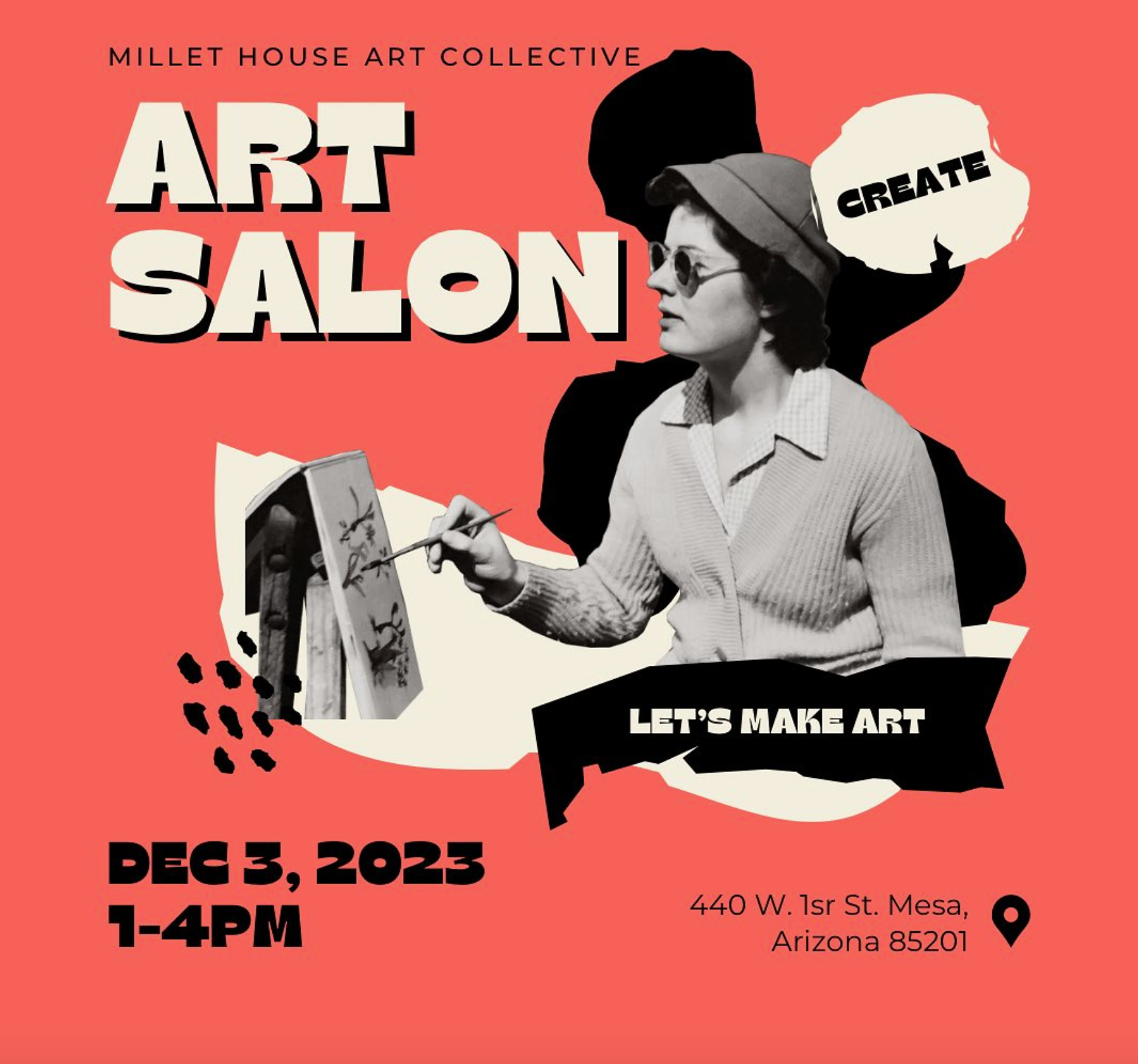 Once a month, the Millet House Art Collective holds a Salon. This month, the Salon will happen on December 3, 1-4 pm. Come to talk about art, show your art, see others’ works and works in progress, and create together. Or, just come and hang out with us. All are welcome! There may be tea!