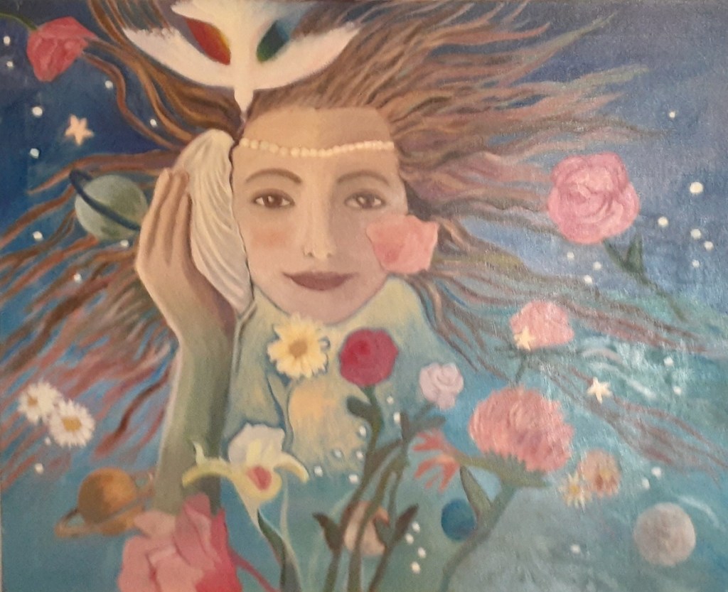 Description: The Maid of Heaven listens to the sounds of the universe. References to the writings of the Baha’i faith say that we are “stars of one heaven”, waves of one sea”, and “flowers of one garden.” The painting is a depiction of those words. Oil on canvas; Artist’s collection.