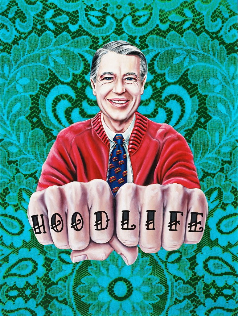 MR. ROGERS HOOD LIFE • oil, acrylic, and spray paint on wood panel • 18″ by 24″