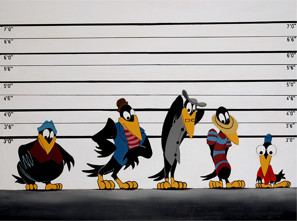 THE USUAL SUSPECTS • Acrylic and oil on wood panel • 24″ by 36″ Dumbo is one of my all time favorite movies. I love the black crow characters in this film however they are very ‘black’. This movie was created in 1941 when sadly racism was much more acceptable. I had read that Walt Disney was a anti-semite, misogynist, and racist so I painted these character in a police lineup to convey the racial profiling that African Americans have dealt with over the years.