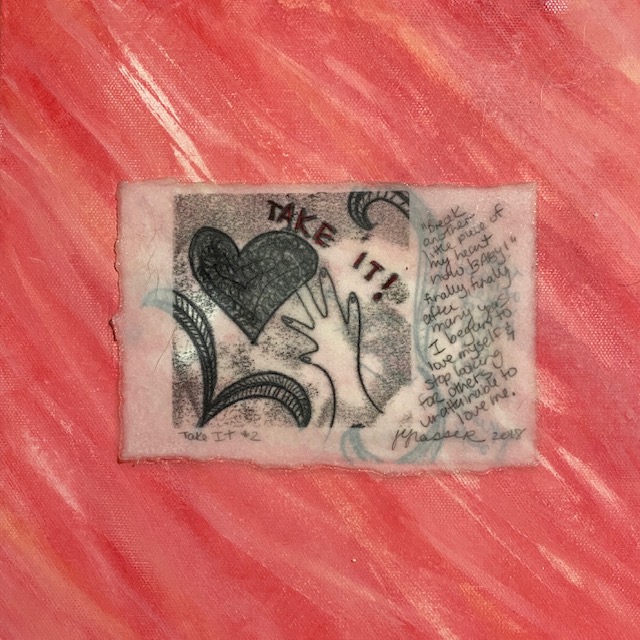 Suzy writes, “I painted this in March and April 2020 as I was working on processing this new reality. It is an abstract intuitive exercise, starting late one night with the lights off, making random marks on a new canvas, choosing paints randomly. As I worked on it over several weeks, images emerged and I began to make more intentional choices. I shared the process on Facebook and friends would comment that they saw stories related to the times we’re living in.”