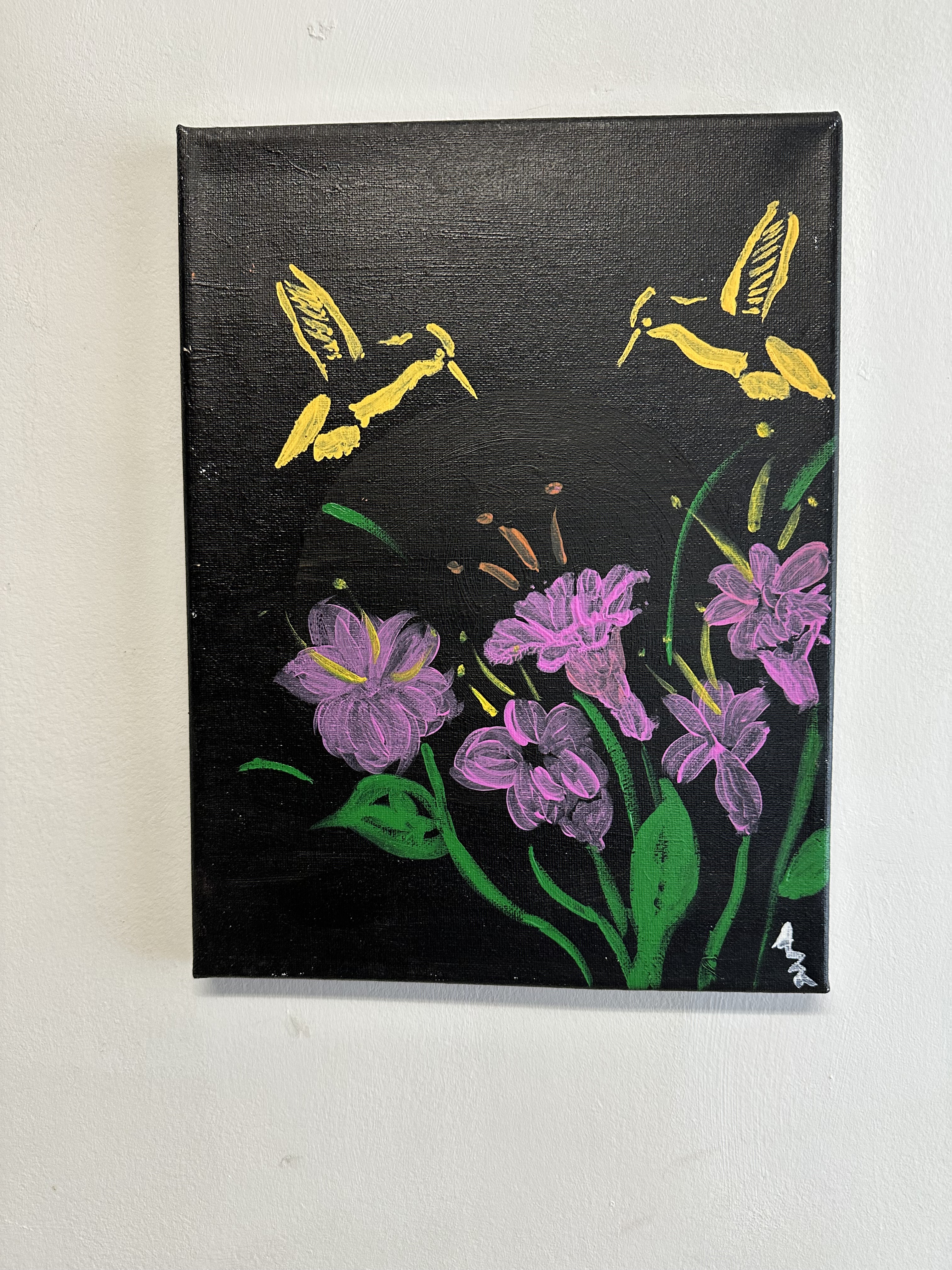 “Hummingbirds” / Abeni Jackson, San Carlos Apache / Acrylic on Canvas / 10″x8″ / $120